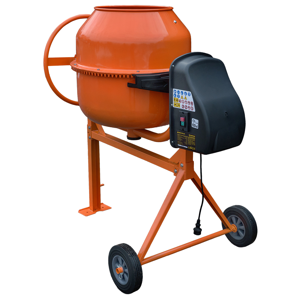 Модель оснащена потужним електродвигуном 0,85 кВт, який стабільно працює від стандартної електромережі 230 В / 50 Гц, що робить бетонозмішувач зручним у використанні в побутових умовах і на невеликих будівельних майданчиках. Посилена конструкція рами гарантує високу стійкість і надійність під час роботи навіть із повністю завантаженим барабаном.