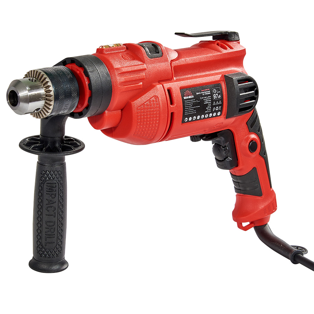 Дриль обладнана металевим патроном із ключовим затискачем, який дозволяє надійно фіксувати свердла діаметром до 13 мм. Завдяки ергономічній додатковій рукоятці інструмент зручно тримати обома руками, що знижує втому та підвищує точність виконання завдань. Для ще більшого комфорту передбачено фіксатор кнопки пуску — користувач може заблокувати кнопку під час тривалої роботи, не утримуючи її постійно.