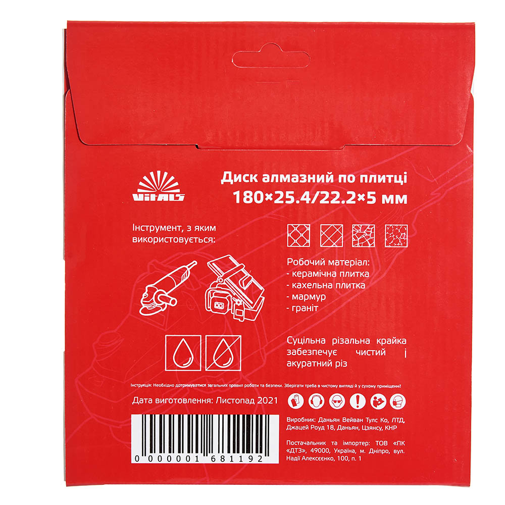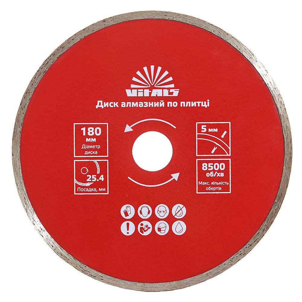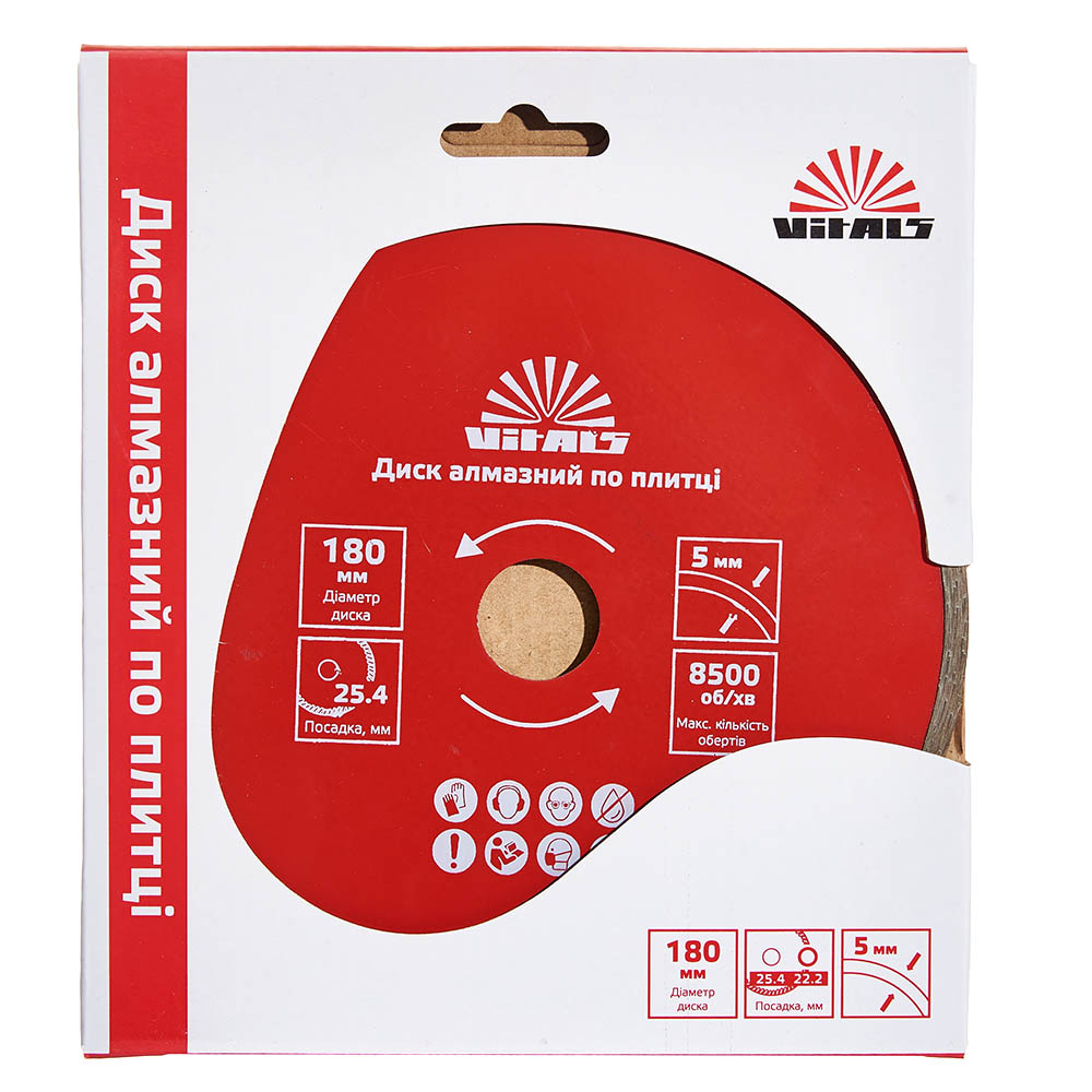 Алмазний диск Vitals по плитці180х25.4/22.2х5 мм призначений для різання керамічної та кахельної плитки, мармуру, граніту. Може використовуватися як для сухого, так і для мокрого різання.