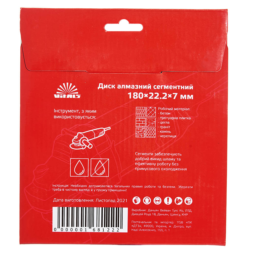 Диск алмазний сегментний Vitals 180х22.2х7 мм призначений для ефективного різання бетону, тротуарної плитки, цегли, граніту, каменю та черепиці. Може використовуватися як для сухого, так і для мокрого різання.