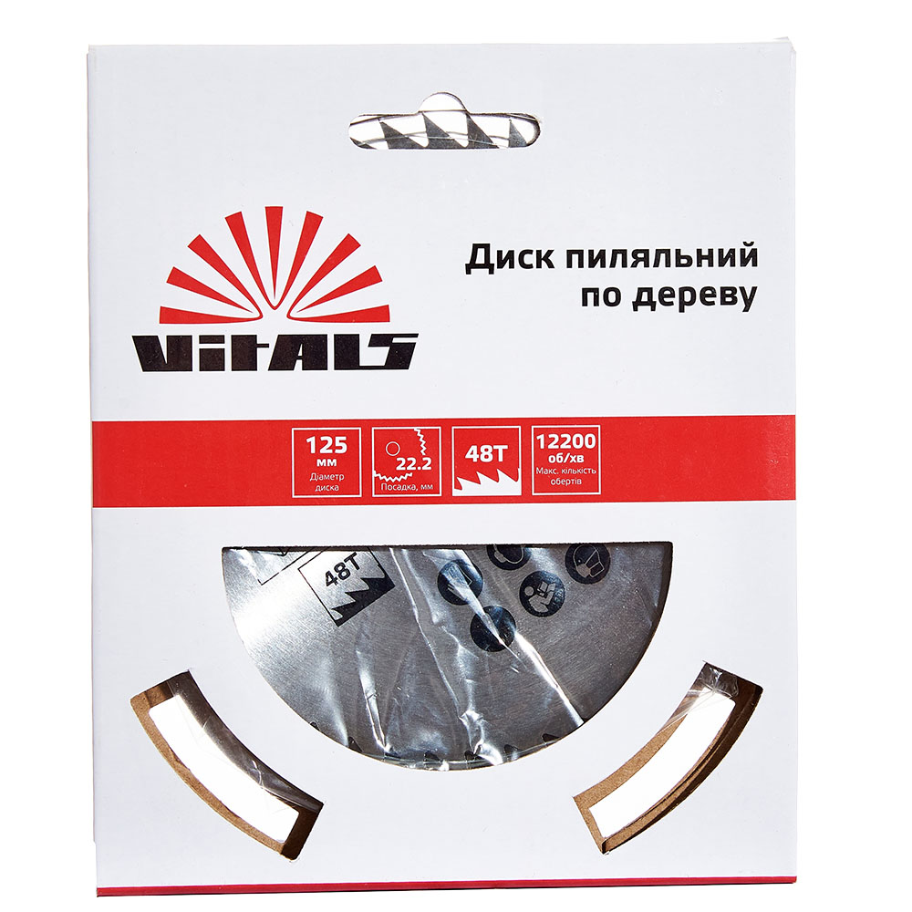 Пиляльний диск Vitals по дереву 125x22.2, T 48 підходить для поздовжнього та поперечного розпилу деревини - як м'якої, так і твердої породи, а також ДВП, ДСП.