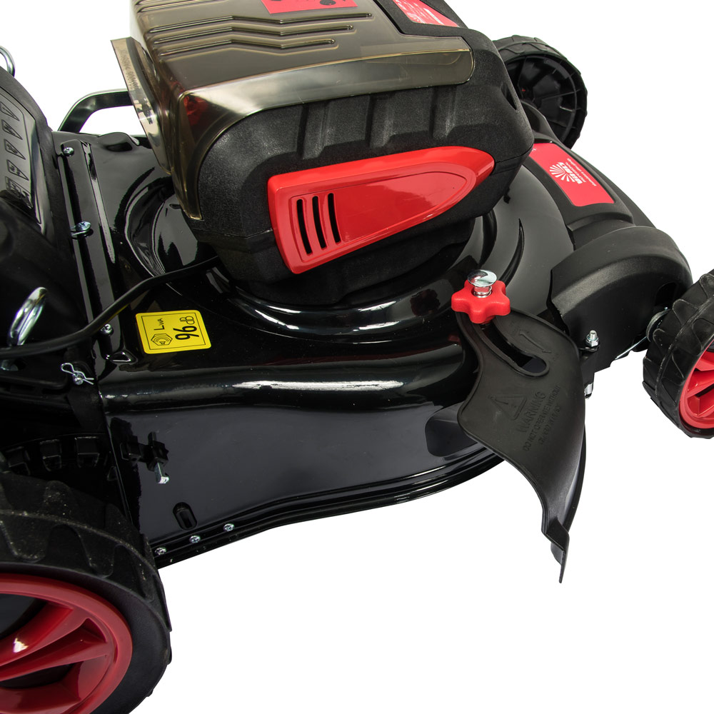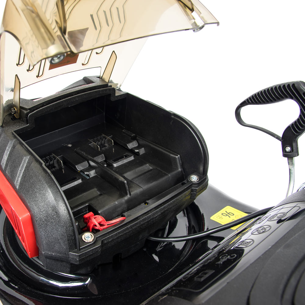 Задля безпечного увімкнення й вимкнення газонокосарки застосовується ключ-запобіжник. Щоб запустити дану модель, треба спочатку вставити ключ в отвір на панелі батарейного відсіку до клацання й фіксації його в посадковому місці. Додатково безпеку забезпечує клавіша, що оберігає від ненавмисного запуску. Завдяки цьому оператор і люди, що перебувають неподалік, захищені від випадкового увімкнення агрегату. Газонокосарка не становить небезпеки на ділянці, де є маленькі діти, адже без ключа вони не зможуть її увімкнути.