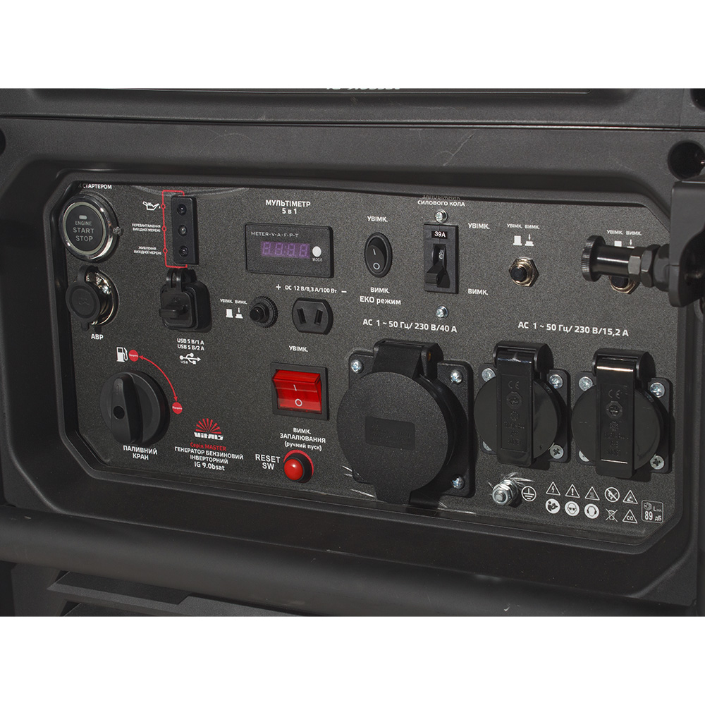 - Цифровий контролер 5 в 1: Дає змогу контролювати ключові параметри роботи генератора, зокрема напругу, силу струму, частоту, навантаження і мотогодини.