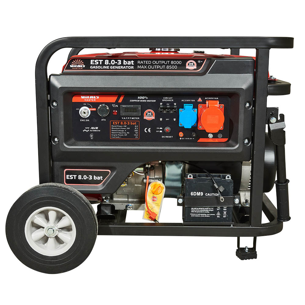 У генераторі Master EST 8.0-3 bat встановлений альтернатор синхронного типу. Він характеризується стабільними потужністю й напругою. Витримує великі (вище за номінальний) струми, що короткочасно виникають під час запуску реактивного навантаження, наприклад, електродвигуна.