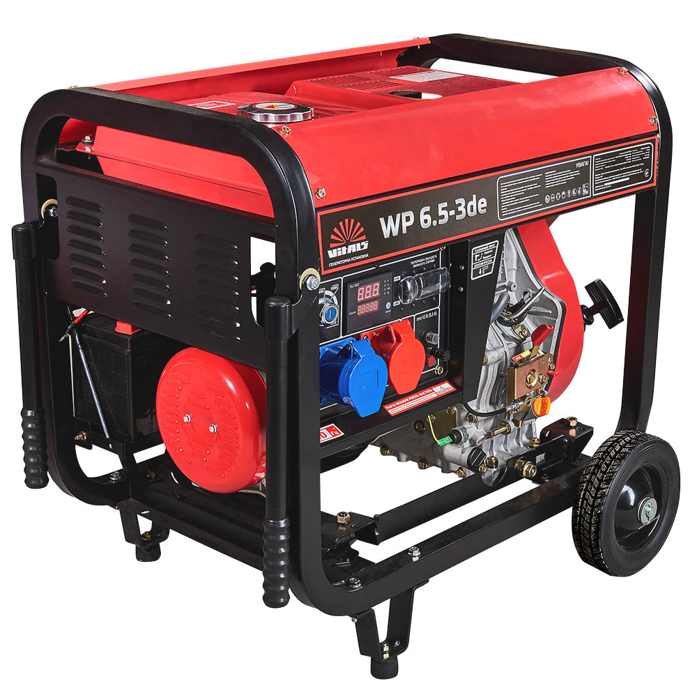 Дизельний генератор Vitals WP 6.5-3de – це переносний електричний агрегат, призначений для резервного або аварійного живлення побутових споживачів. Виробляє однофазний / трифазний змінний струм напругою 230 / 400 В, частотою 50 Гц. Особливістю моделі Vitals WP 6.5-3de є можливість використання генератора на повну потужність (6.5 кВт) як в однофазній, так і трифазній мережі.