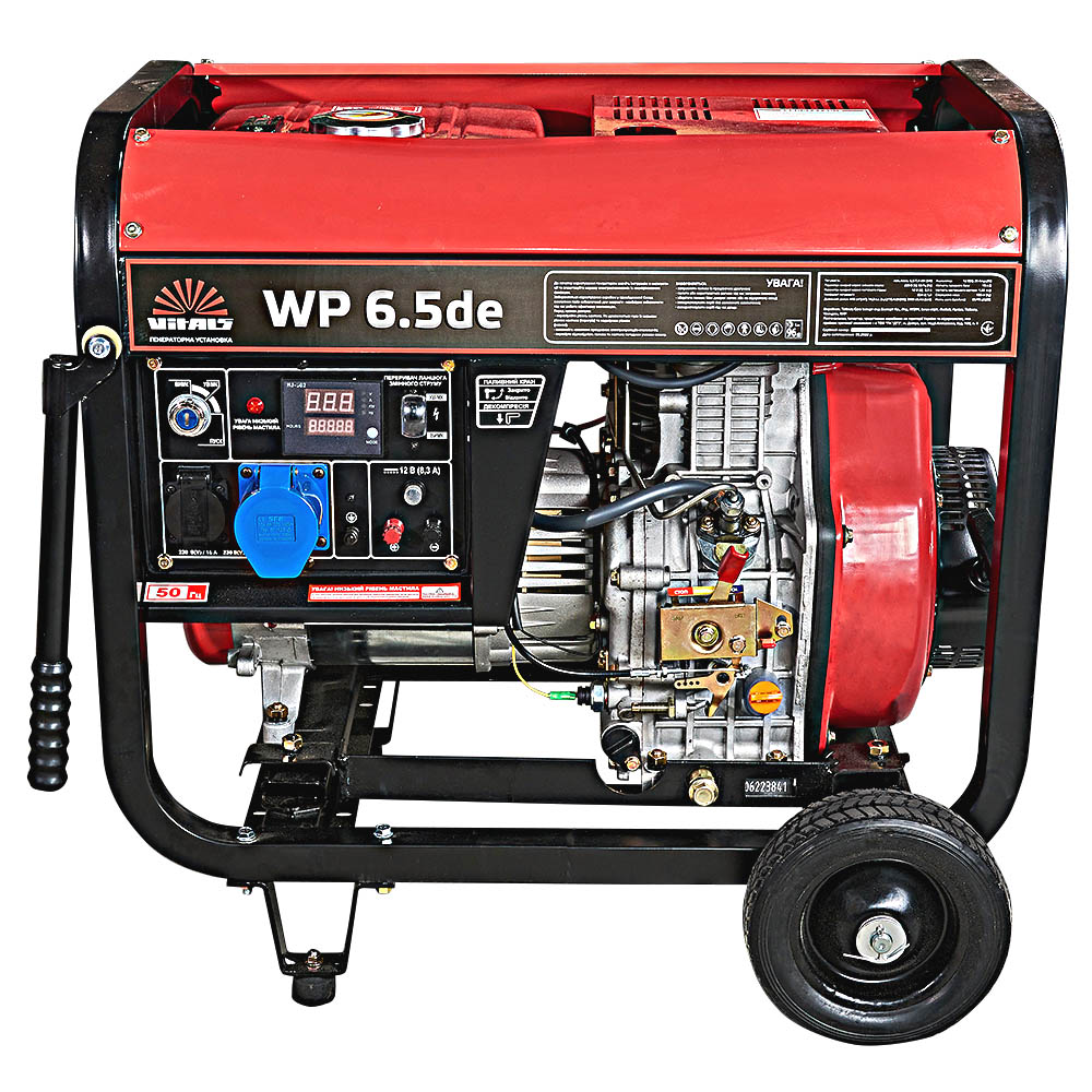 Дизельний генератор Vitals WP 6.5de – це переносний електричний агрегат, призначений для резервного або аварійного живлення побутових споживачів. Виробляє однофазний змінний струм напругою 230В, частотою 50 Гц.