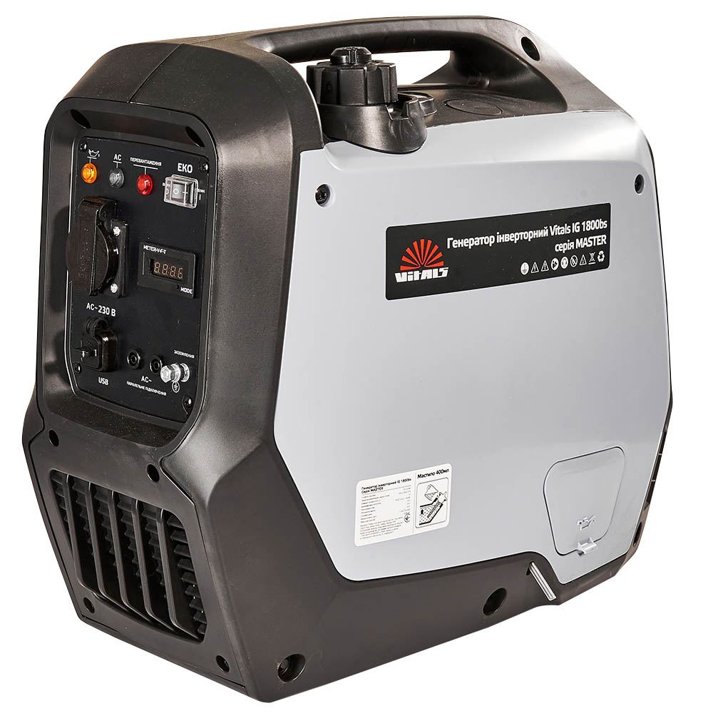 Бензиновий інверторний генератор Vitals Master IG 1800bs – компактний переносний електричний агрегат, призначений для резервного або аварійного живлення побутових споживачів. Виробляє правильний змінний однофазний струм напругою 230 В, частотою 50 Гц.