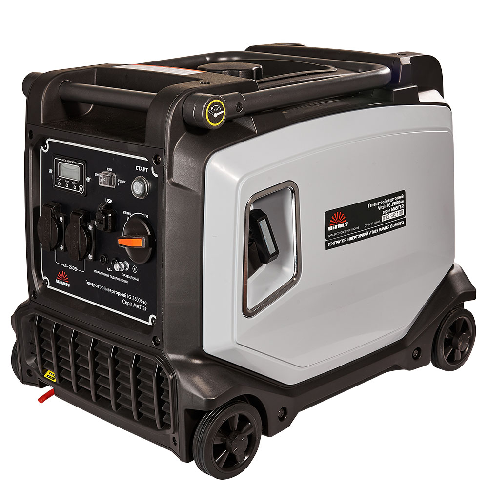 Бензиновий інверторний генератор Vitals Master IG 3500bse – компактний переносний електричний агрегат, призначений для резервного або аварійного живлення побутових споживачів. Виробляє правильний змінний однофазний струм напругою 230 В, частотою 50 Гц.