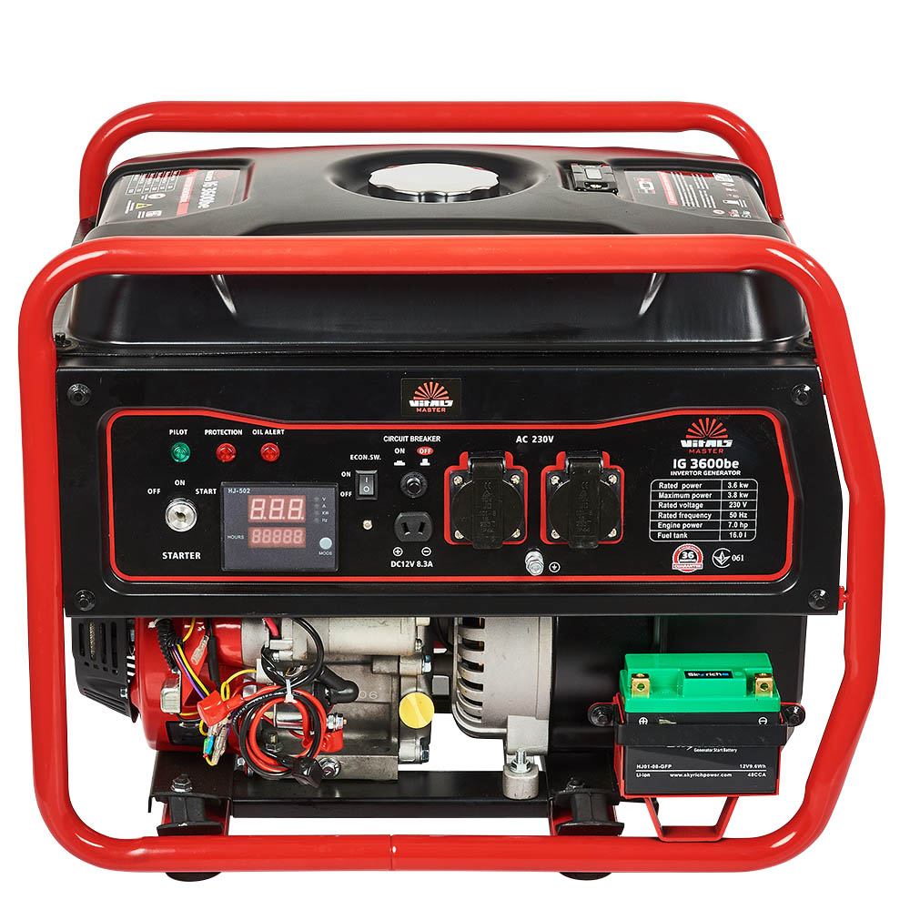 Бензиновий інверторний генератор Vitals Master IG 3600be — компактний переносний електричний агрегат, призначений для резервного або аварійного живлення побутових споживачів. Виробляє правильний однофазний змінний струм напругою 230 В, частотою 50 Гц.