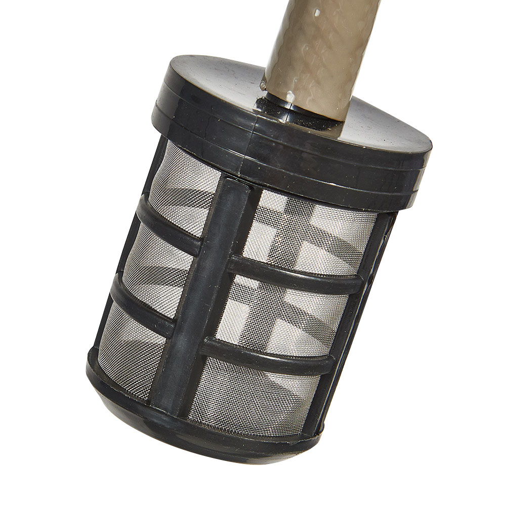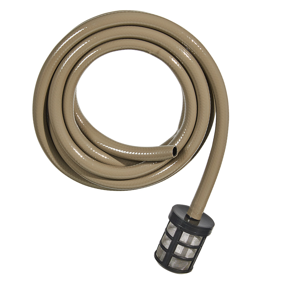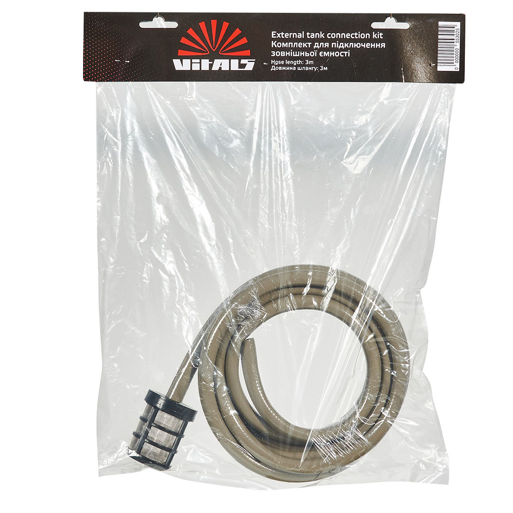 Комплект підключення мийки високого тиску до відкритої ємності складається з двох елементів: армованого пластикового шлангу і приєднаного до нього об'ємного циліндричного вхідного фільтра.