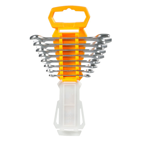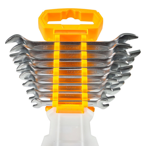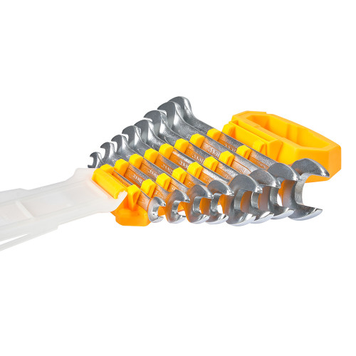 У комплекті представлено 8 ключів із двома робочими розмірами кожен: 6×7, 8×9, 10×11, 12×13, 14×15, 16×17, 18×19, 20×22 мм — загалом 16 робочих позицій. Усі інструменти компактно розміщено на полімерній картці для зручного транспортування та зберігання.