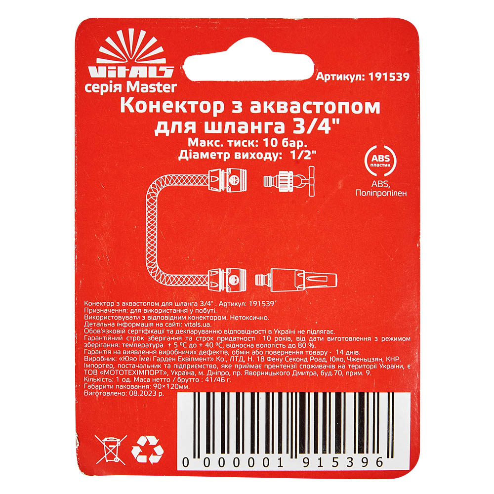 Характеристики на Конектор з аквастопом 1/2" для шланга 3/4" Vitals Master