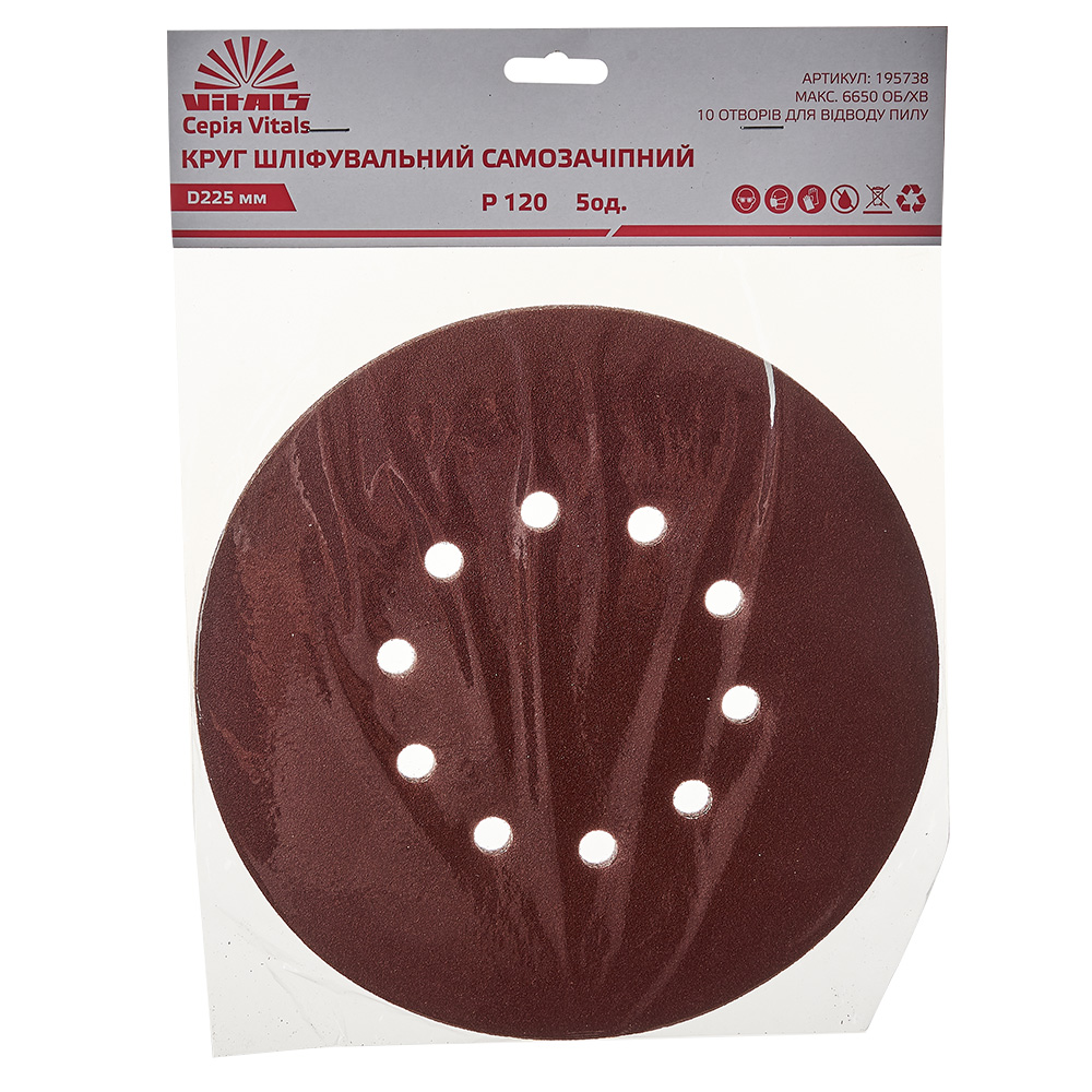 Шліфувальний круг самозачіпний Vitals 225 мм, 10 отворів, зернистість P120 (5 од.) — це високоякісний інструмент, призначений для роботи з полірувальними шліфувальними машинами. Ці круги ідеально підходять для обробки штукатурки, а також можуть бути використані для шліфування стін і стель. Діаметр круга становить 225 мм, що дозволяє ефективно працювати з великими площинами, зменшуючи час на обробку.