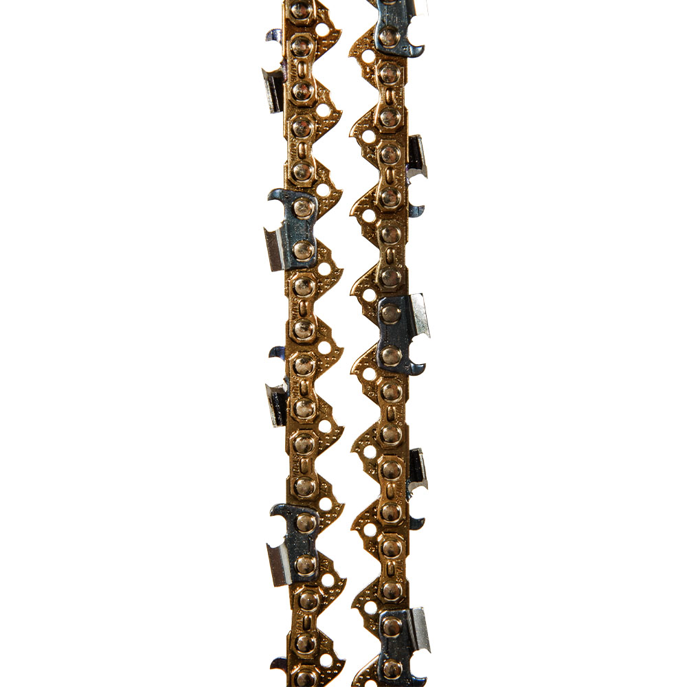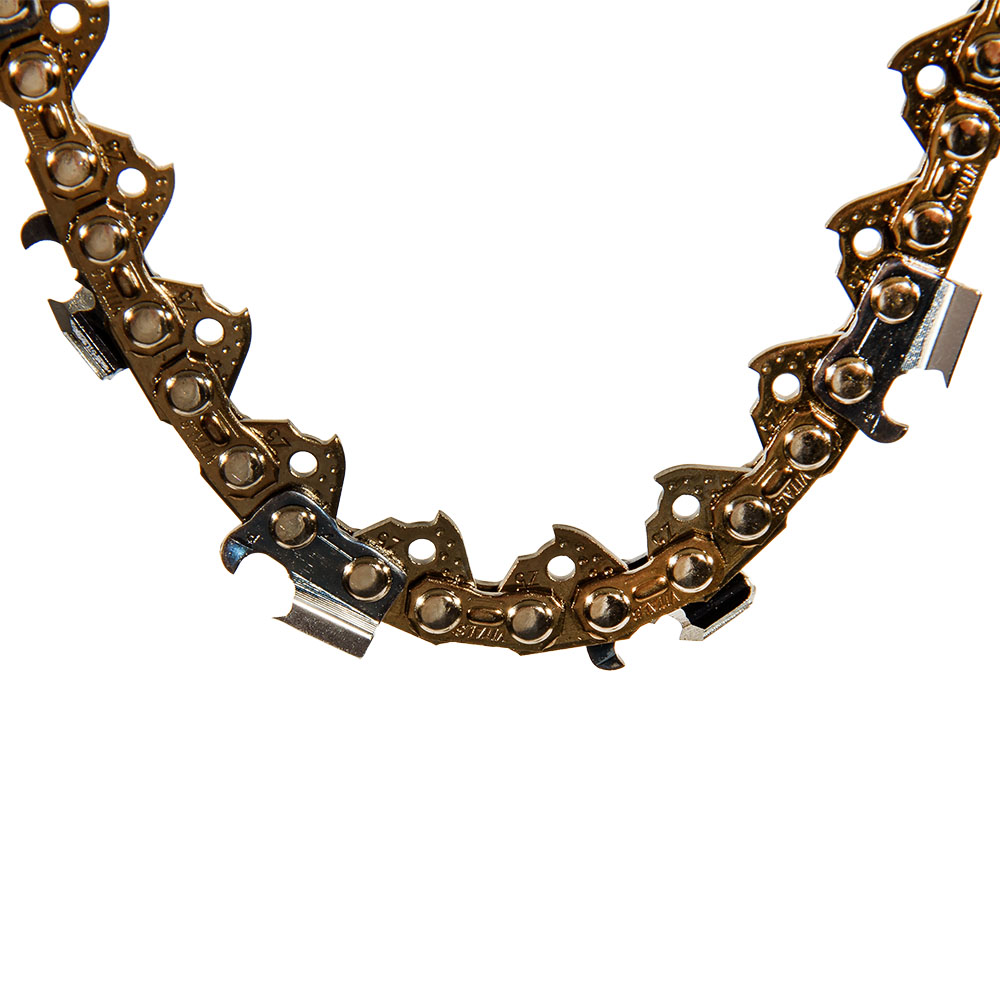 Ланцюг виготовлений з легованої закаленої сталі підвищеної міцності, що робить його стійким до зносу, перегріву, деформацій та корозії навіть при інтенсивній роботі. Режучі зуби виготовлені з високоякісної сталі 68CrNiMo, яка відрізняється підвищеною твердістю, зносостійкістю та довговічністю. Завдяки цьому ланцюг має тривалий термін служби без втрати ріжучих властивостей, навіть при щоденній інтенсивній експлуатації, а ріжучі кромки довше залишаються гострими у порівнянні з побутовими аналогами, що зменшує потребу в частій заточці та обслуговуванні.