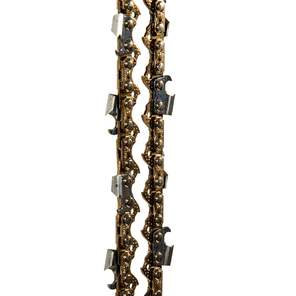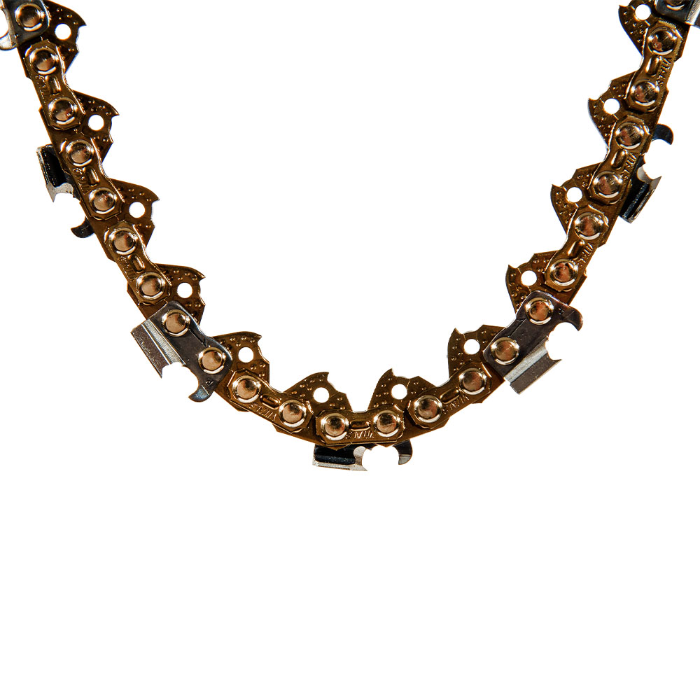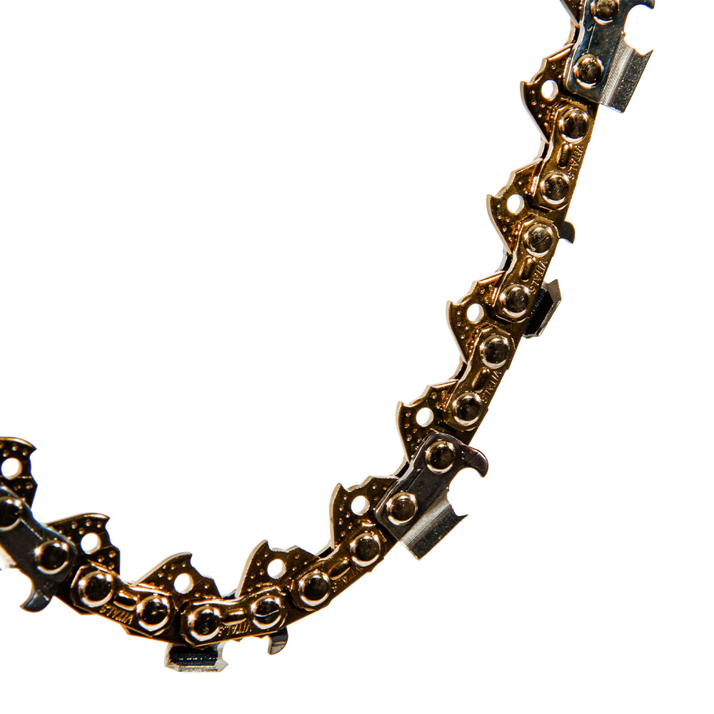 Ланцюг виготовлений з легованої закаленої сталі підвищеної міцності, що робить його стійким до зносу, перегріву, деформацій та корозії навіть при інтенсивній експлуатації. Режучі зуби виготовлені з високоякісної закаленої сталі 68CrNiMo, яка відзначається підвищеною твердістю, зносостійкістю та довговічністю. Завдяки цьому ланцюг має тривалий термін служби без втрати ріжучих властивостей, навіть при щоденній інтенсивній роботі. Ріжучі кромки довше залишаються гострими у порівнянні з побутовими аналогами, що зменшує потребу в частій заточці та обслуговуванні.