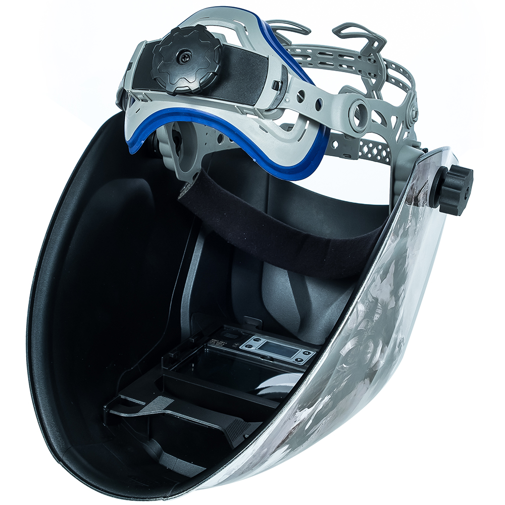 Оголів’я маски з м'яким гіпоалергенним налобником дає змогу домогтися оптимального розташування щитка щодо обличчя оператора завдяки налаштуванню в п’яти площинах.
