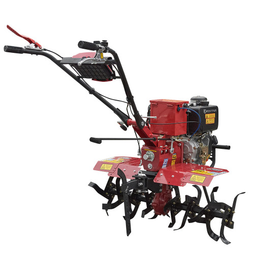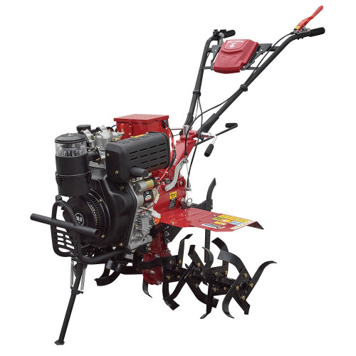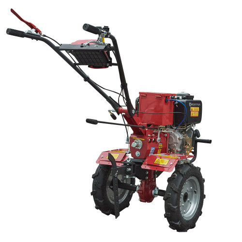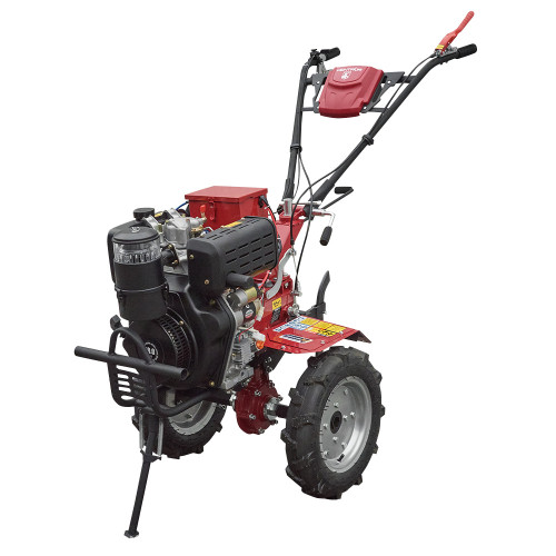 - Оснащений потужним дизельним двигуном об'ємом 10 кінських сил, що забезпечує високу продуктивність та ефективність роботи як при обробці ґрунту, так і при транспортуванні вантажів на причепі.