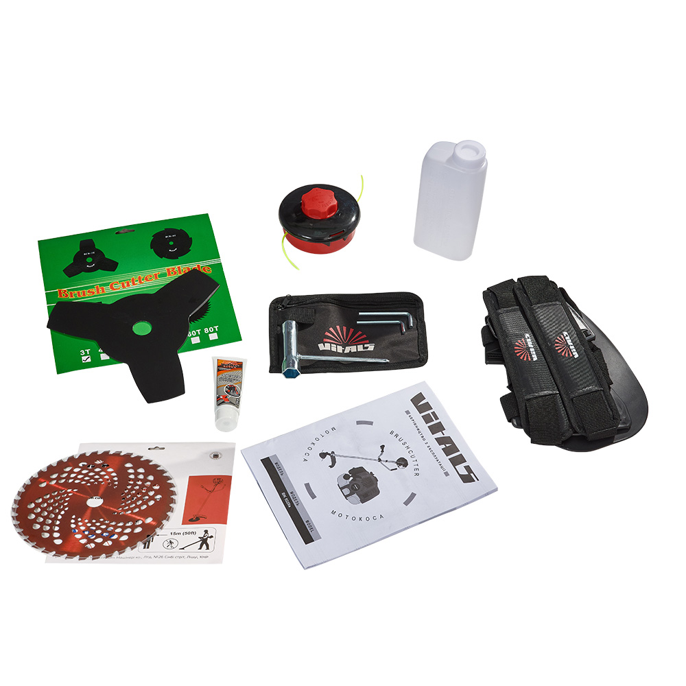 Мотокоса (силовий агрегат, штанга, конічний редуктор, стикувальний вузол)|Роздільні рукоятки|Ємність для приготування паливної суміші|Ергономічна ранцева жилетка|Шпуля з ліскою|Тризубчастий ніж|Мультизубчастий ніж|Комплект інструментів|Тканинна сумка для набору інструмента|Керівництво з експлуатації|Упаковка.