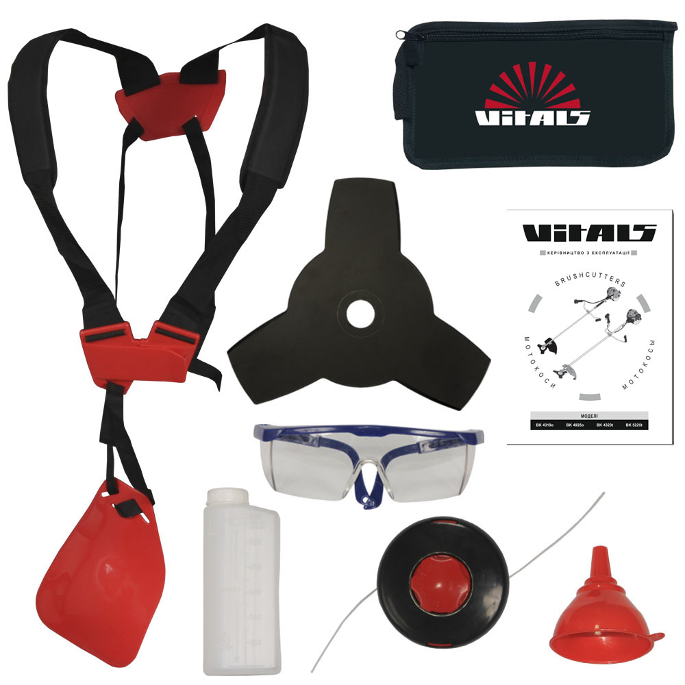 Силовий агрегат|Штанга з конічним редуктором і стикувальним вузлом|Роздільні рукоятки|Ранцева жилетка|Котушка з ліскою|Трипелюстковий ніж|40-зубий ніж|Захисний кожух|Нерухомий ніж|Комплект інструментів і кріпильних виробів|Захисні окуляри|Сумка з тканини для набору інструментів|Інструкція з експлуатації|Упаковка.