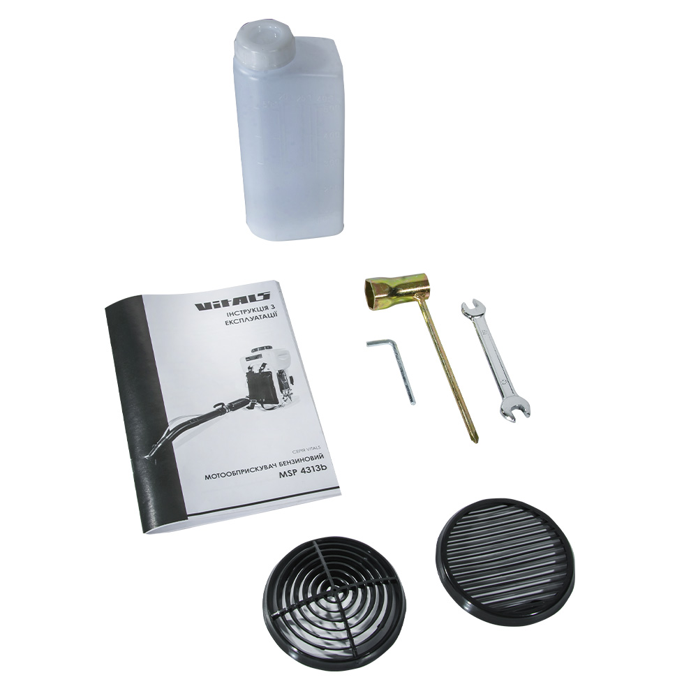 Обприскувач у зборі|Воронка|Кран|Ємність для приготовання паливної суміші|Розтруб|Шестигранний ключ 5 мм|Шестигранний ключ 4 мм|Рожковий ключ 8х10 мм|Викрутка|ДТ-подібний ключ 17х19 мм (комбінація свічкового ключа та викрутки)|Шланг|Патрубок|Колінчатий патрубок|Гофрований патрубок|Спіральний хомут.