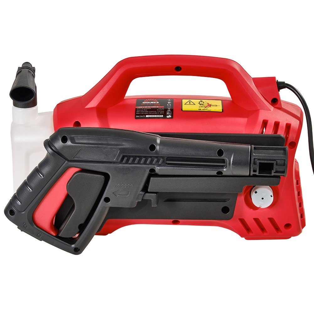 Зручний для роботи пістолет забезпечений механізмом швидкого підключення шлангу високого тиску. Насадка на пістолет дає змогу регулювати форму напірного струменя.
