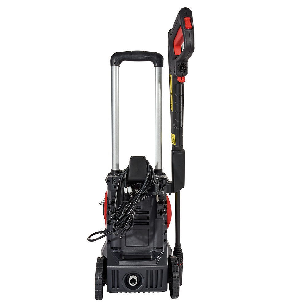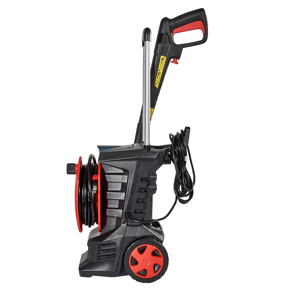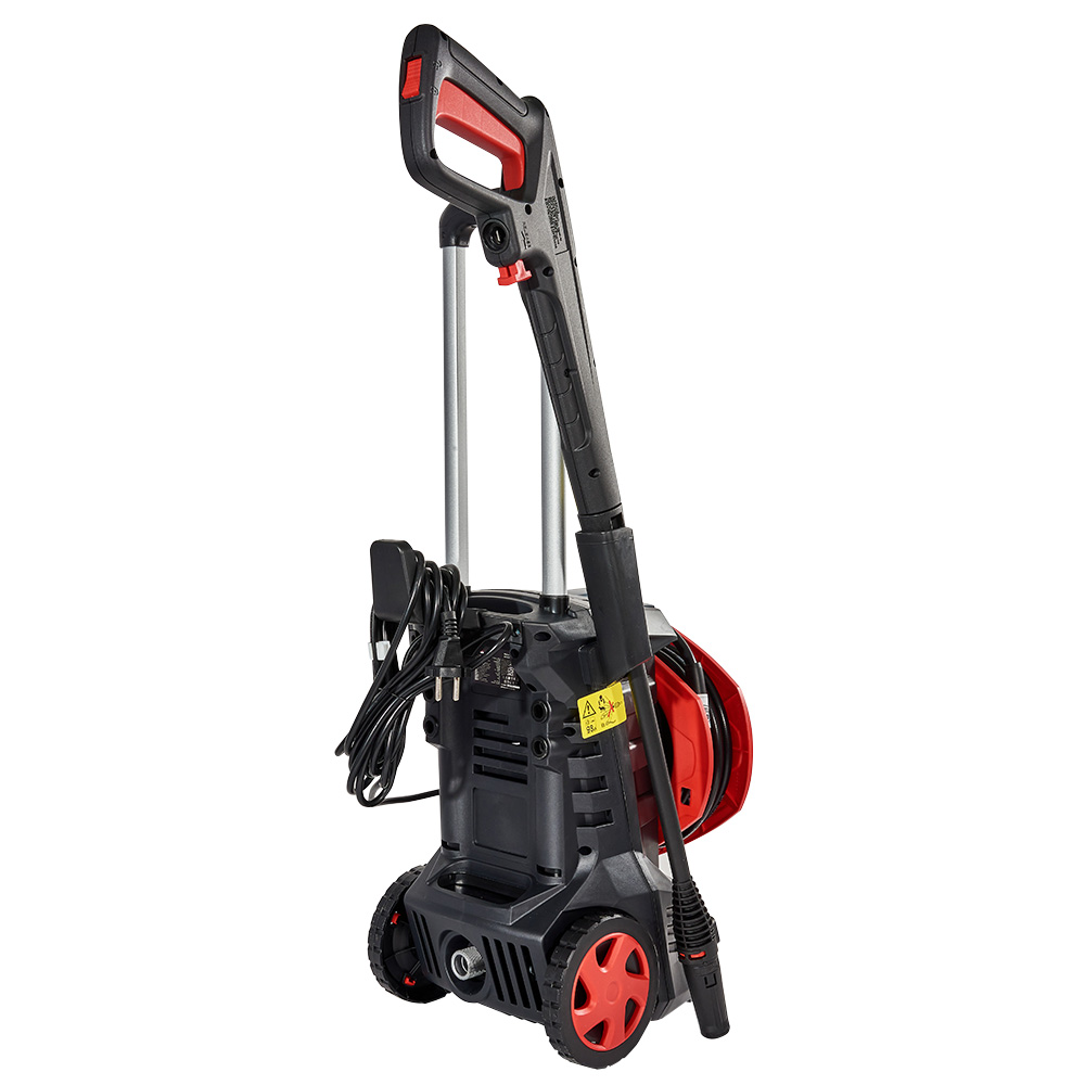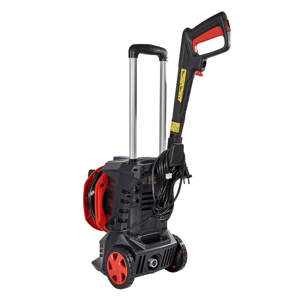 Приводний електродвигун і насос високого тиску об’єднані в блок. Робочий інструмент — пістолет з форсункою — під’єднаний до насоса п’ятиметровим шлангом високого тиску. Щоб шланг не займав занадто багато місця, не заважав роботі й переміщенню, мийка оснащена спеціальною котушкою для намотування шлангу. Для зручності переміщення мийка оснащена колесами та телескопічною ручкою.