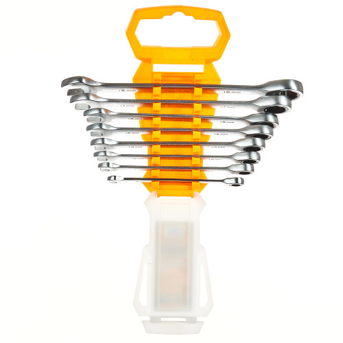 Кожен ключ має комбіновану конструкцію: з одного боку — ріжкова головка, з іншого — кільцева з вбудованим тріскачковим механізмом. Це дозволяє проводити роботи без необхідності знімати ключ після кожного обороту, що особливо зручно у важкодоступних місцях або при обмеженому просторі. Завдяки цьому набір забезпечує швидкість, комфорт і ефективність під час роботи.