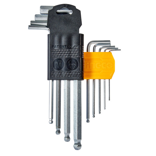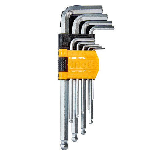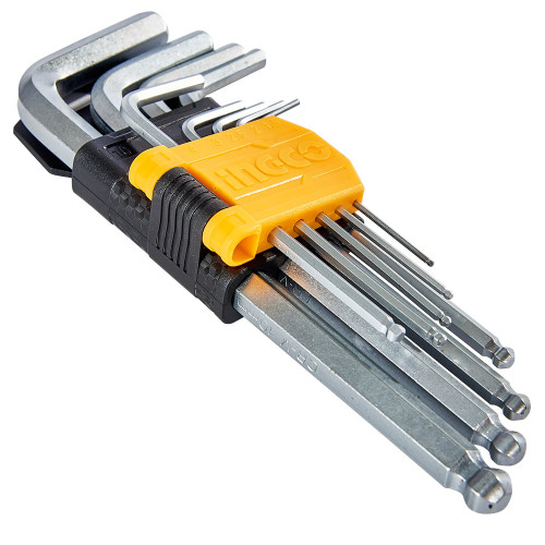 Набір шестигранних ключів із кулею 9 шт. 1,5–10 мм INGCO — це професійний комплект, розроблений для монтажу і демонтажу кріплень з внутрішнім шестигранним шліцом навіть у важкодоступних місцях. Особливістю цього набору є наявність кульової головки на кінці кожного ключа, що забезпечує кутовий доступ і дозволяє працювати під кутом до 25°, значно спрощуючи роботу в складних умовах.