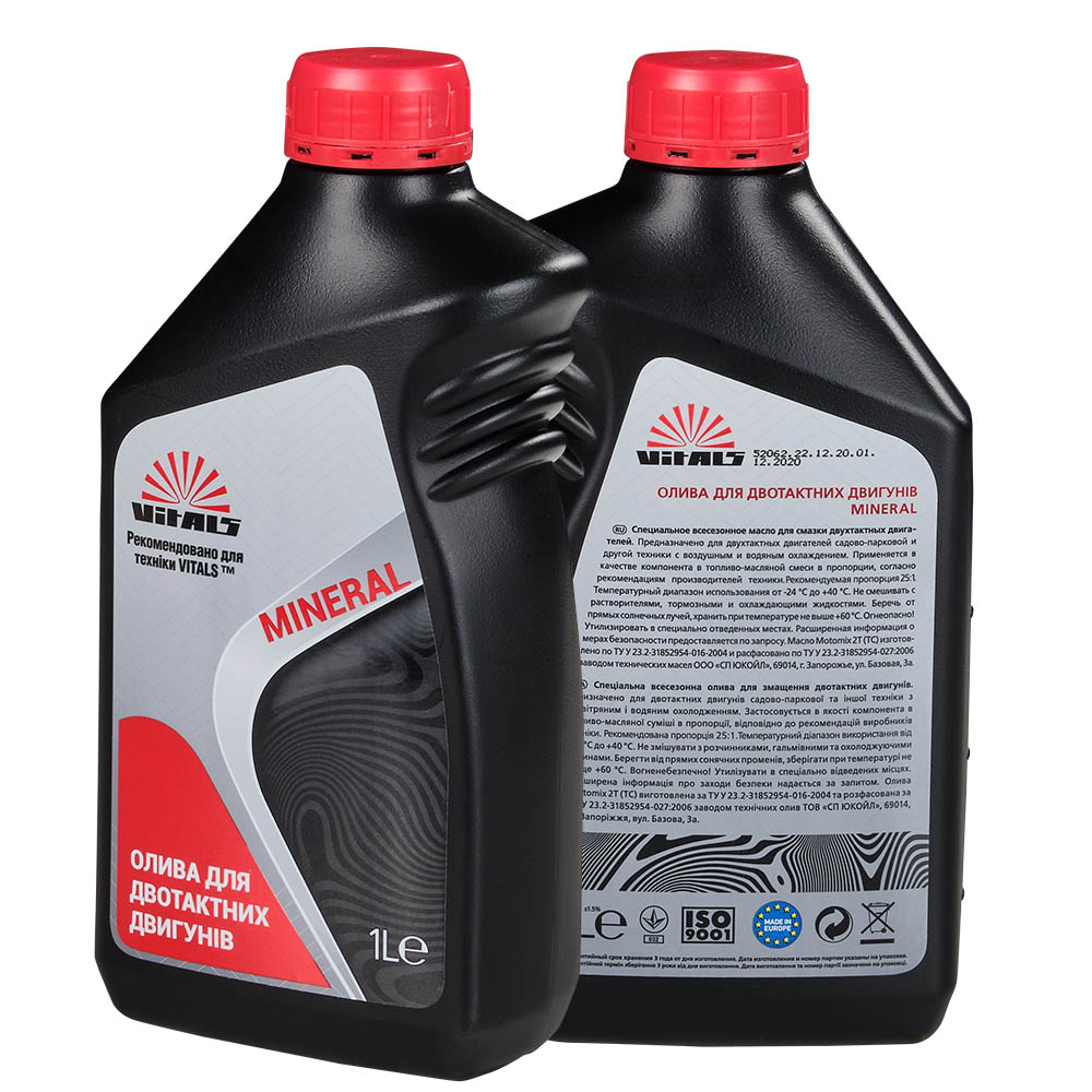 Спеціальна всесезонна моторна олива Vitals™ призначена для двотактних двигунів садово-паркової та іншої техніки з повітряним і водяним охолодженням. Дана олива застосовується в якості компонента в паливо-масляній суміші в пропорції, згідно з рекомендаціями виробників техніки. Типове введення становить 32:1 – 50:1.