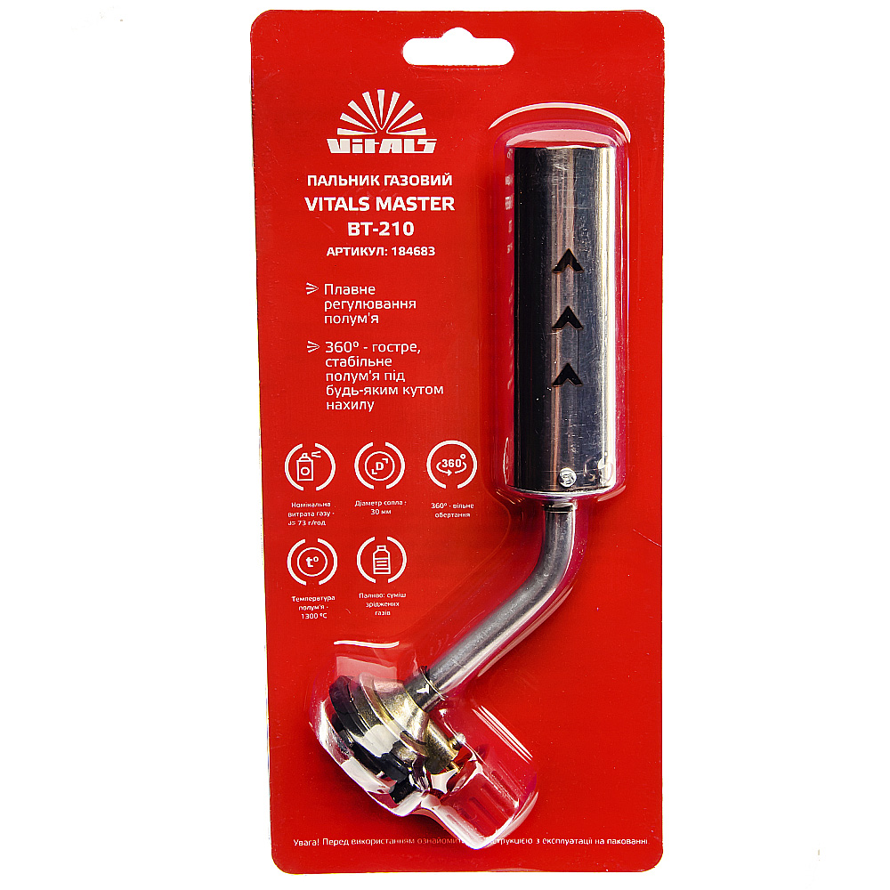 Пальник газовий 360° Ø30 мм Vitals Master BT-210 призначений для розпалювання багать та мангалів, хобі та моделювання, паяння з'єднань труб, видалення фарби, розігріву замерзлих водопровідних труб.