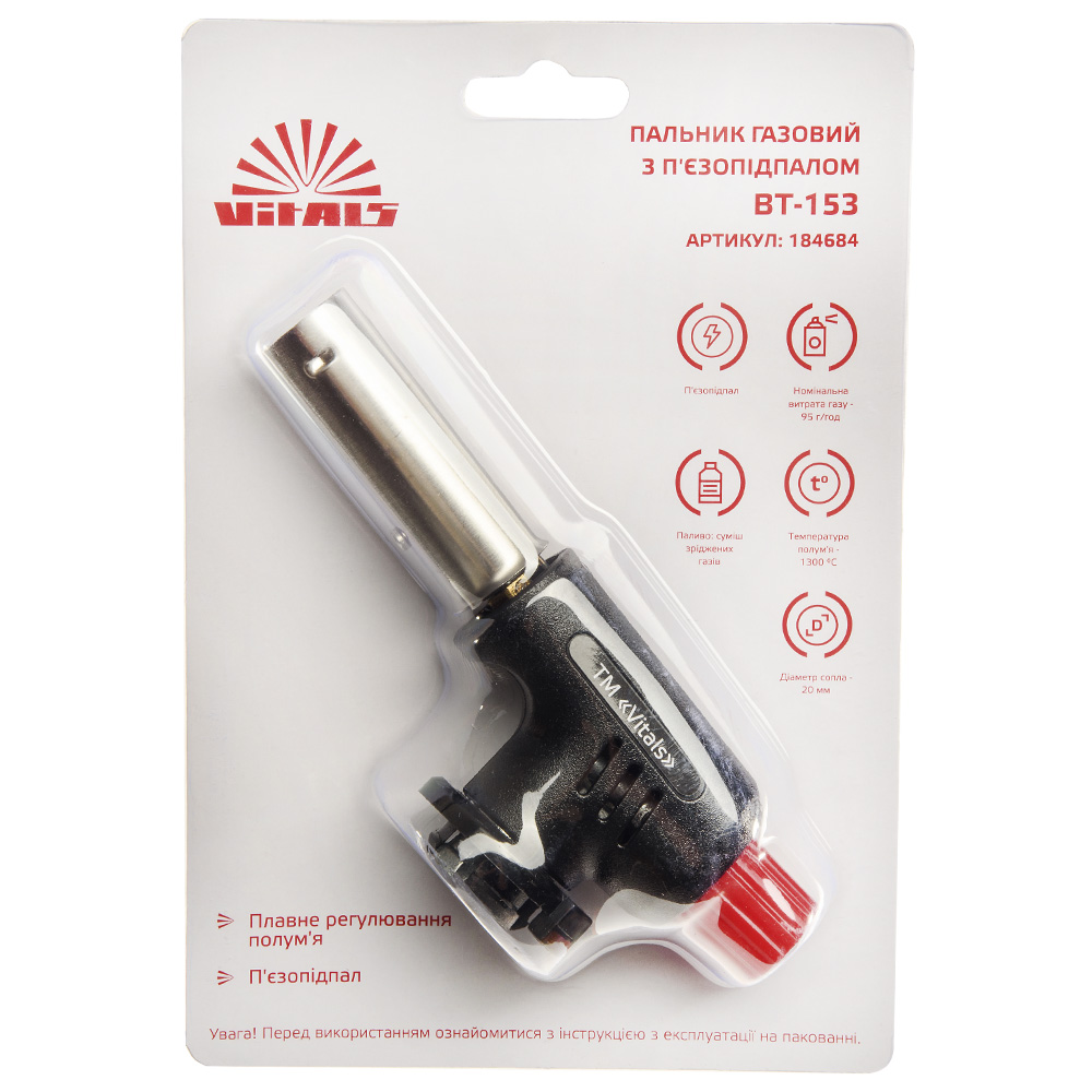 Пальник газовий з п'єзопідпалом Ø20 мм Vitals BT-153 призначений для розпалювання багать та мангалів, хобі та моделювання, паяння з'єднань труб, видалення фарби, розігріву замерзлих водопровідних труб.