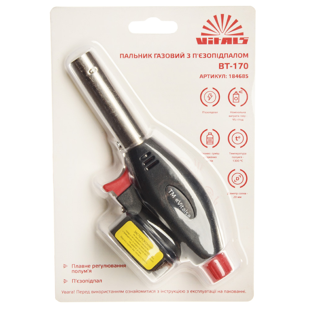 Пальник газовий з п'єзопідпалом Ø20 мм Vitals BT-170 призначений для розпалювання багать та мангалів, хобі та моделювання, паяння з'єднань труб, видалення фарби, розігріву замерзлих водопровідних труб.
