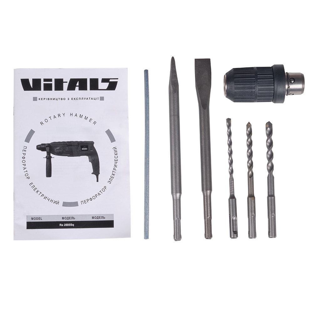 Перфоратор Vitals Ra 2885Sq має сучасний дизайн, надійний у роботі, простий у використанні й обслуговуванні, оснащений патроном із хвостовиком стандарту SDS-plus, який дає можливість легко і швидко замінити свердло, піку або долото.