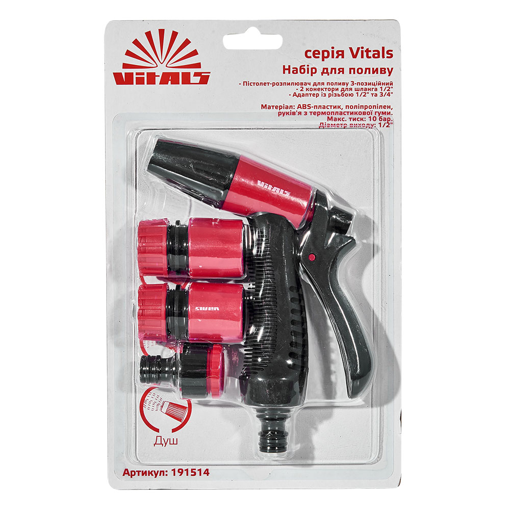 Характеристики на Пістолет-розпилювач 3-позиційний + адаптер з різьбленням 1/2", 3/4" та 2 конектори для шланга 1/2" Vitals