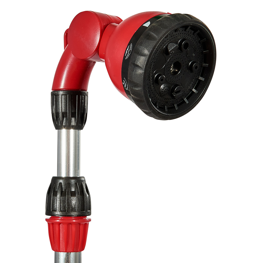 Розпилювальна голова має можливість вибору нахилу, що дозволяє налаштувати струмінь води залежно від потреб вашого саду чи городу. Регулятор тиску на ручці дозволяє контролювати інтенсивність поливу, а перемикач режимів поливу дозволяє швидко змінювати вид струменя за допомогою 9 різних режимів.