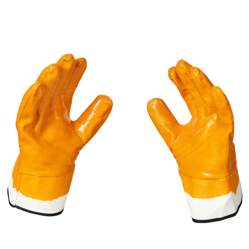 Ці рукавички виготовлені з міцного матеріалу та мають повне нітрилове покриття, що гарантує стійкість до масла, бензину та інших агресивних рідин. Манжет-крага забезпечує додатковий захист зап’ястя та нижньої частини руки від бризок і бруду.