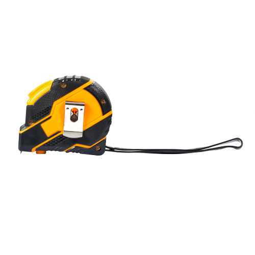 Корпус рулетки виготовлений із міцного ударостійкого пластику з прогумованими вставками, які забезпечують надійний захист від падінь та механічних пошкоджень. Контрастне маркування на металевій стрічці дозволяє легко зчитувати значення, а механізм плавного змотування робить використання інструмента ще зручнішим.