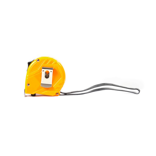 Корпус виготовлений із міцного пластику з прогумованими вставками, що забезпечує стійкість до ударів і падінь. Завдяки ергономічній формі рулетка зручно лежить у руці, а кліпса для кріплення дозволяє легко носити її із собою. Чітке контрастне маркування гарантує комфортне зчитування показників, а фіксатор довжини та плавний механізм змотування роблять роботу ще зручнішою.
