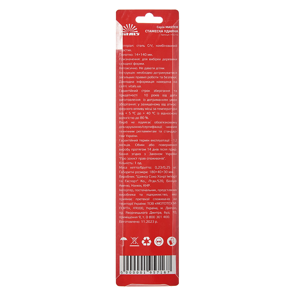 Стамеска 14×140 мм Vitals Master — це необхідний інструмент для будь-якого майстра, який шукає надійний і ефективний інструмент для обробки деревини. Вона поєднує в собі високу якість, зручність і довговічність, що робить її чудовим вибором для професіоналів і аматорів.