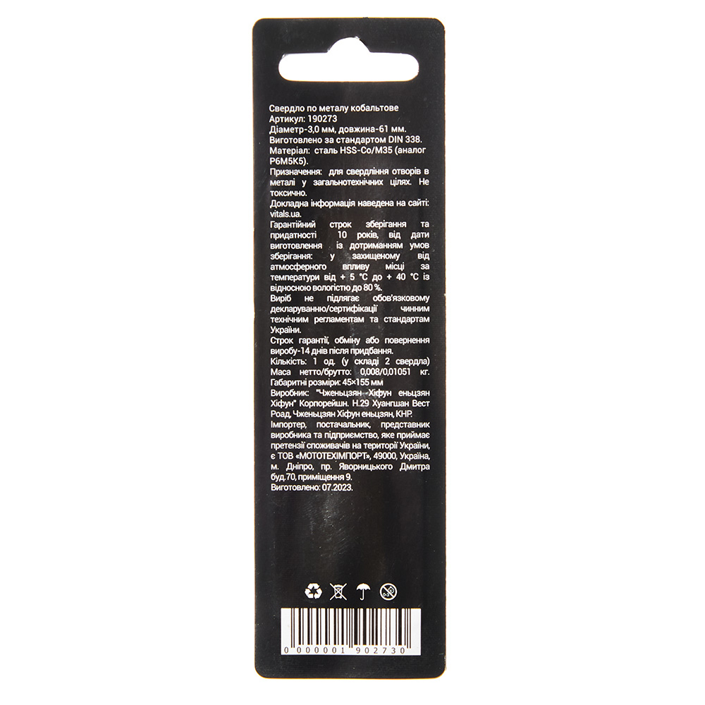 Характеристики на Свердло по металу HSS-Co/M35 3.0 (2 од.) Vitals Professional