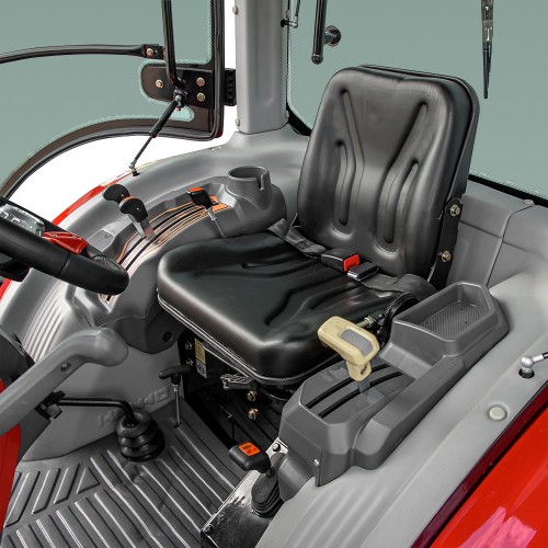 Механічна шестеренчаста коробка передач зі схемою (4×2)+(4×2) із реверсом і пониженими передачами. Двохдискове сухе сцеплення постійно замкнутого типу, гідрооб’ємне кермо з окремим насосом, барабанні гальма з роздільним керуванням коліс для точного та безпечного маневрування. Повний привід 4×4 підвищує прохідність трактора.
