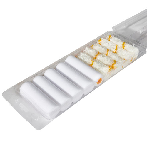 До комплекту входить 10 змінних роликів, виготовлених із поєднання акрилу та поліестеру, що дає змогу обрати оптимальний варіант для різних типів поверхонь і фарб. П’ять поліакрилових роликів із висотою ворсу 12 мм ідеально підходять для рівномірного нанесення фарби на стіни та поверхні з незначною текстурою. Вони добре утримують фарбу та забезпечують насичений і рівний шар покриття.