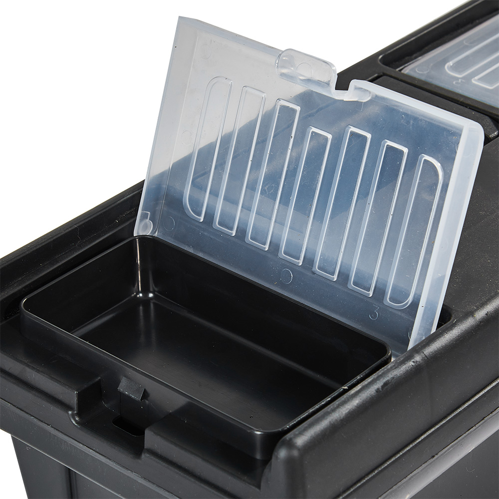 Він оснащений органайзерами, які допомагають організувати простір для зберігання дрібних деталей і витратних матеріалів, забезпечуючи їх систематизацію. Тут можна знайти місце для цвяхів, шайб, гайок, свердел та іншого. Крім того, є переносний знімний лоток для інструменту з гніздами для біт, що робить організацію ще зручнішою.