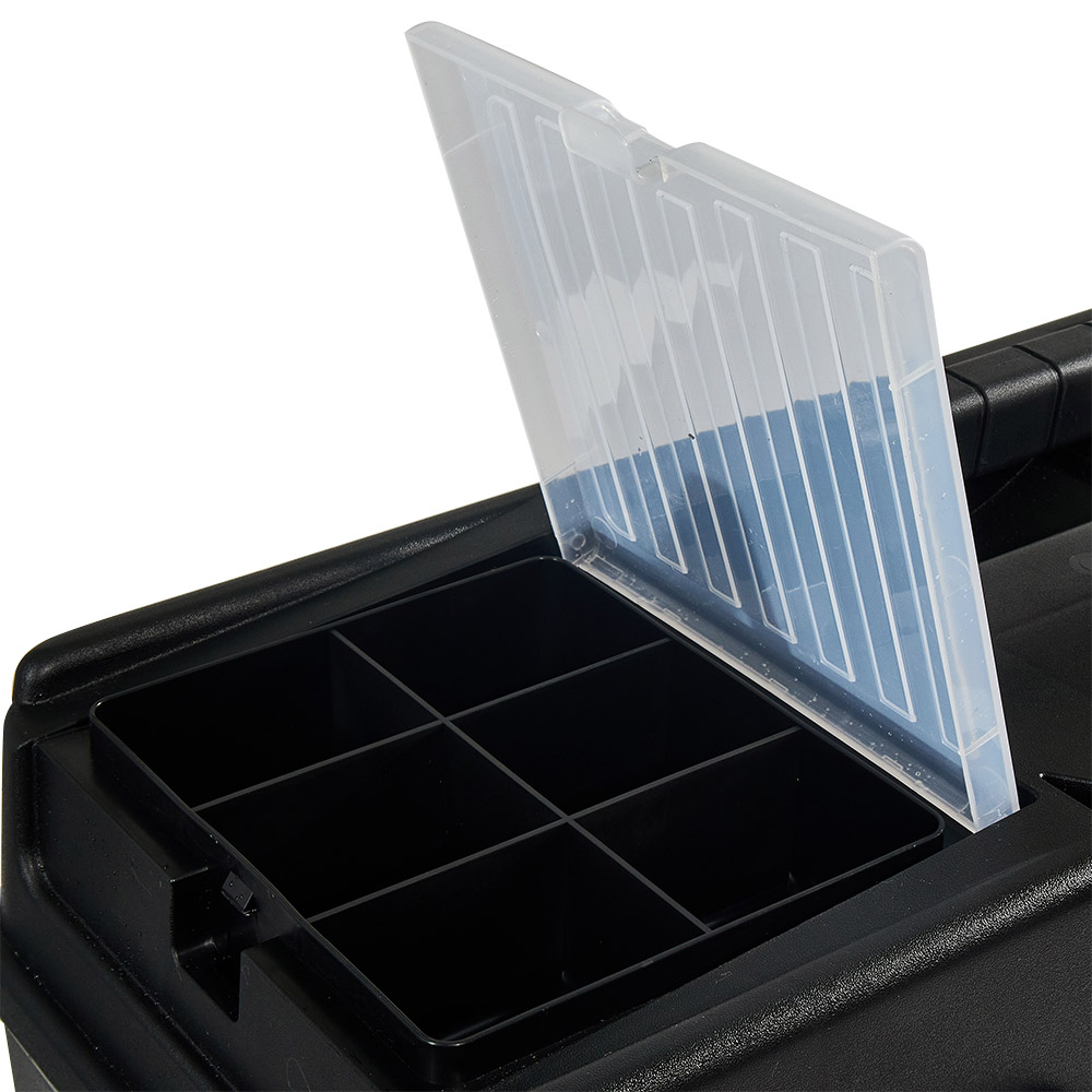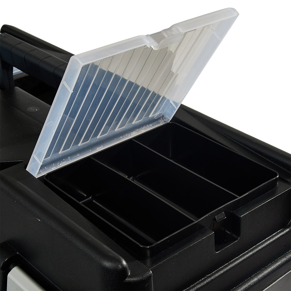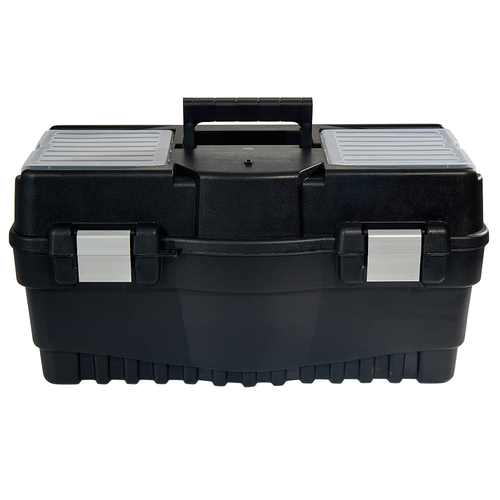 Корпус ящика виготовлений з ударостійкого АБС-пластику, що забезпечує надійний захист інструменту від пошкоджень. Міцні металеві замки гарантують безпечне закриття ящика, захищаючи його вміст від випадкового відкриття.