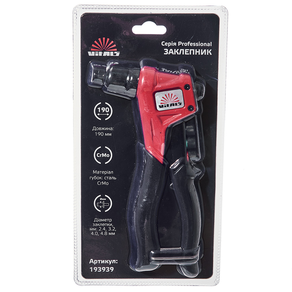 Заклепник Vitals Professional 190 мм — це ідеальне поєднання компактності, зручності, надійності та професійної якості для ефективної роботи з витяжними заклепками.