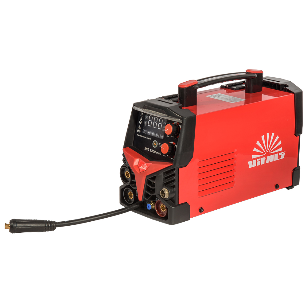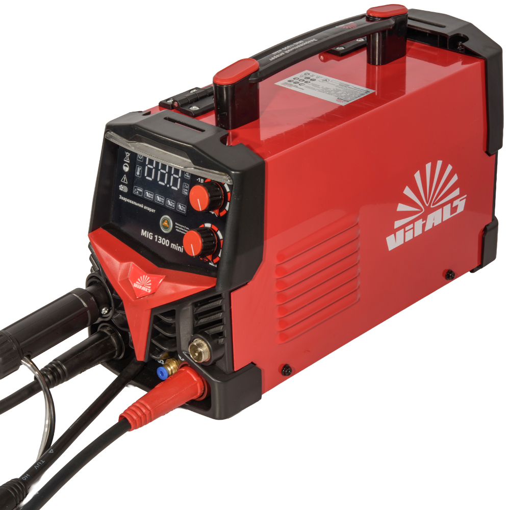 Vitals MIG 1300 mini оснащений цифровим дисплеєм, який відображає основні параметри зварювання та забезпечує точне й наочне налаштування. Інверторна технологія з високим ККД 85% і коефіцієнтом потужності 0,93 гарантує економне споживання електроенергії та стабільне горіння дуги.