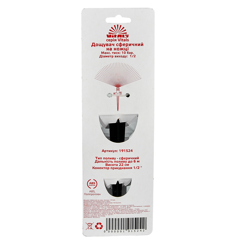 Дощувач сферичний на ніжці Vitals - це ідеальний варіант для забезпечення ефективного та рівномірного поливу вашого саду чи городу. Виготовлений із міцного і надійного АБС-пластику, цей дощувач забезпечує стабільну роботу зрошення протягом тривалого часу.