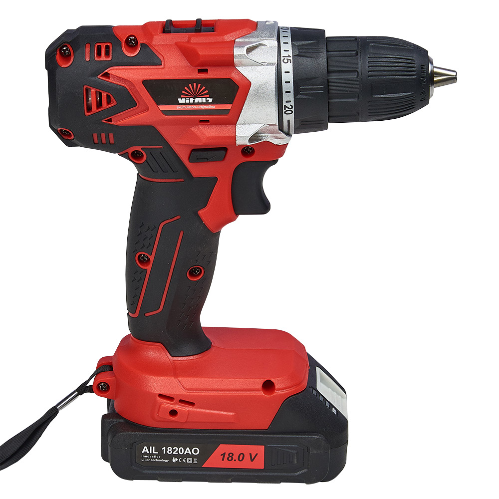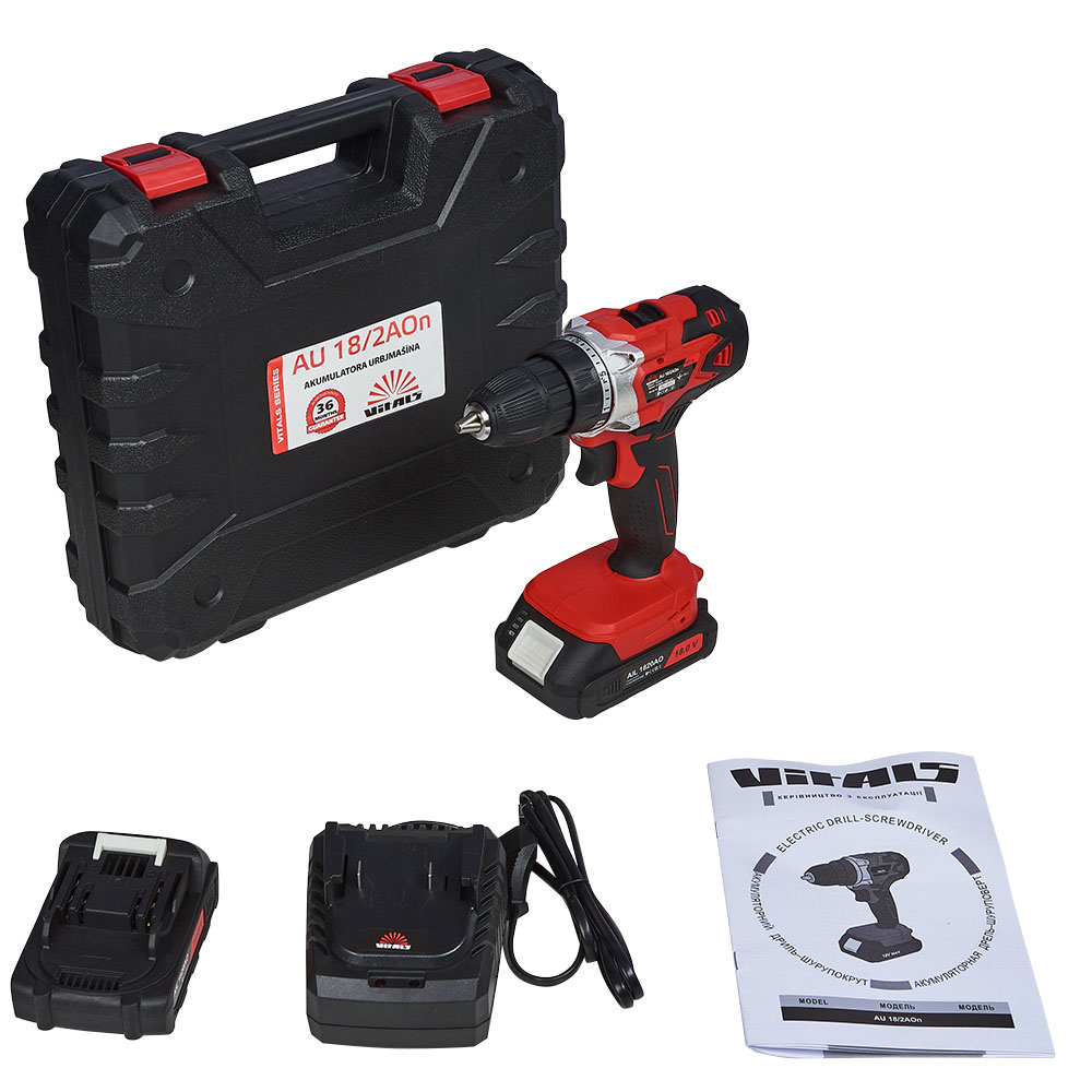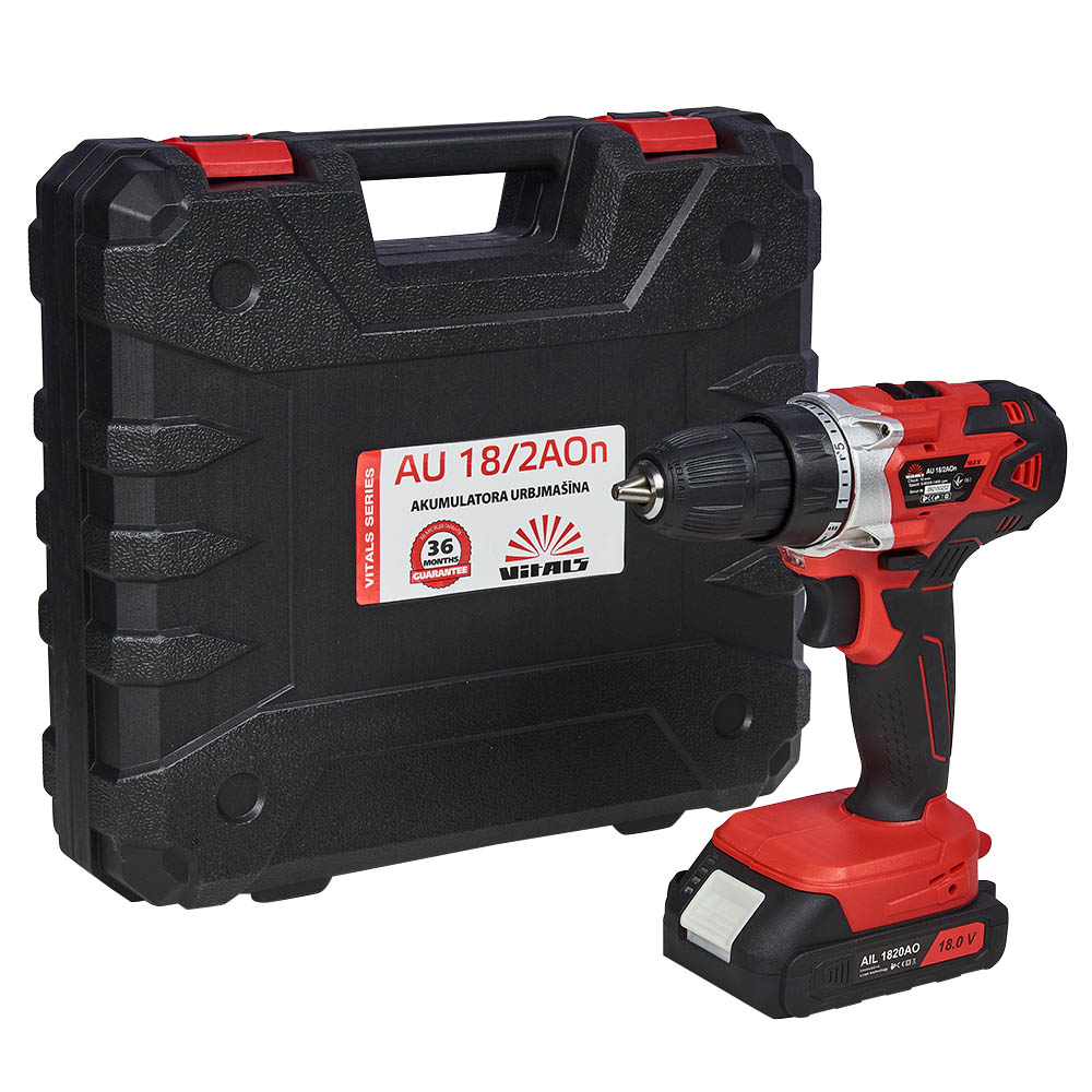 Дриль-шурупокрут акумуляторний Vitals AU 18/2AOn має новий, яскравий дизайн. У комплекті поставки є 2 батареї ємністю 2000 мАг, а також зарядний пристрій. Дриль-шурупокрут акумуляторний Vitals AU 18/2AOn поставляється в міцному пластиковому кейсі для зручності транспортування та зберігання. Максимальний діаметр хвостовика оснащення, який можна зафіксувати у швидкозатискному патроні дорівнює 10 мм. Модель має 2 швидкості обертання шпинделя. Не першої швидкості досягається максимальний момент, що крутить, в 28 Нм, для закручування кріпильних виробів. На другій швидкості досягається високі обороти 1400 об./хв для свердління отворів.