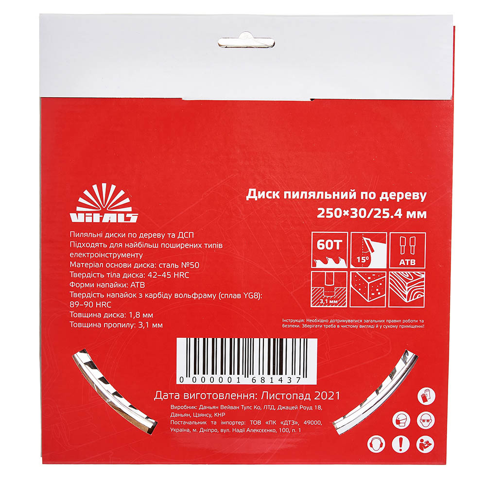 Опис пиляльного диску Vitals по дереву 250x30/25.4, ATB 60