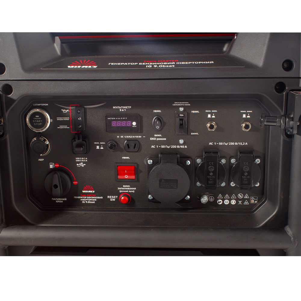 - Цифровий контролер 5 в 1: Дає змогу контролювати ключові параметри роботи генератора, зокрема напругу, силу струму, частоту, навантаження і мотогодини.